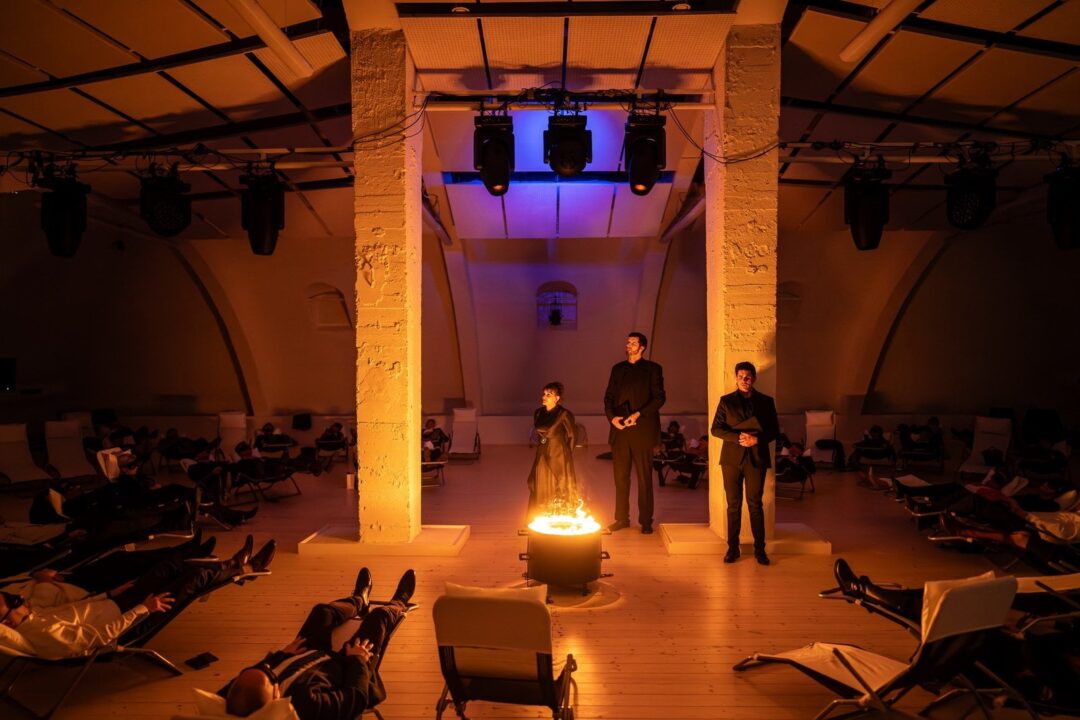 Az Operaház impozáns épületébe belépve rögtön ámulatba estünk, és miközben a nagyteremben párhuzamosan a Bohémélet előadására gyülekeztek az emberek, mi a Medgyaszay terem előtt várakoztunk. Miután leadtuk a kabátjainkat, a teremben nyugágyak, fehér falak és középen lobogó tűz fogadott bennünket Rátóti Zoltánnal, aki már az érkezés pillanatától kezdve a színen volt. Izgalmasan hatott ez a teljesen szokatlan komfort a nyugágyakkal, finom, de erőteljes illatokkal – és ráadásul